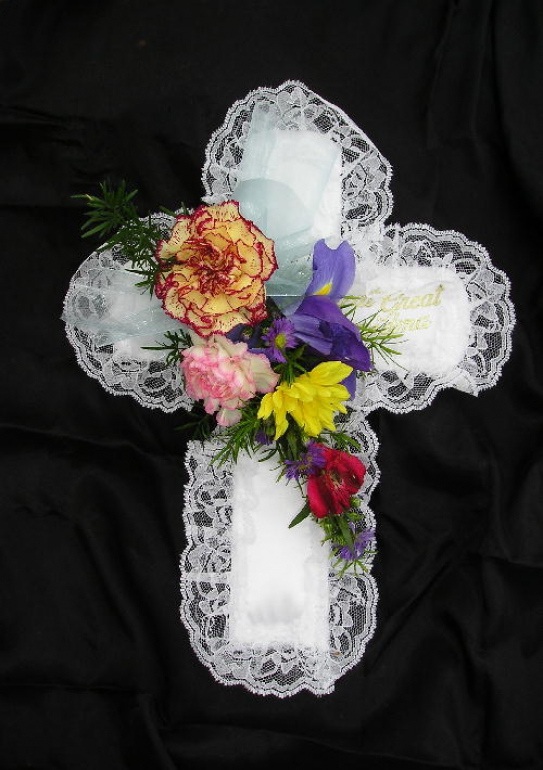 Our cross lid piece is a wonderful memorial from the grandchildren and great-grandchildren and tucks perfectly into the lid of the casket. Shown with a mixture of brightly colored spring flowers, it can be designed in any color combination. It is the perfect companion piece to any of our casket sprays and can easily be designed to match.